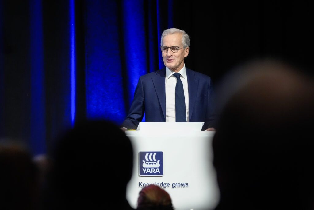 Statsminister Jonas Gahr Støre på Yara sitt årlige Høstseminar på Høymagasinet i Oslo tidligere i november. Temaet i år var “konkurransekraft i en urolig tid”. Foto: Lise Åserud / NTB