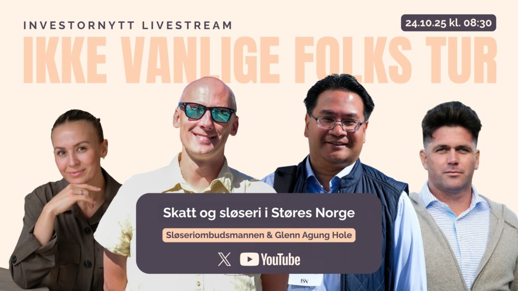 Sendingen starter klokken 08:30 med markedsoppdatering, før temaet «Ikke vanlige folks tur – Skatt og sløseri i Støres Norge» diskuteres fra 08:45. Livesendingen streames på X og YouTube, og publiseres på Investornytt.no i etterkant.
