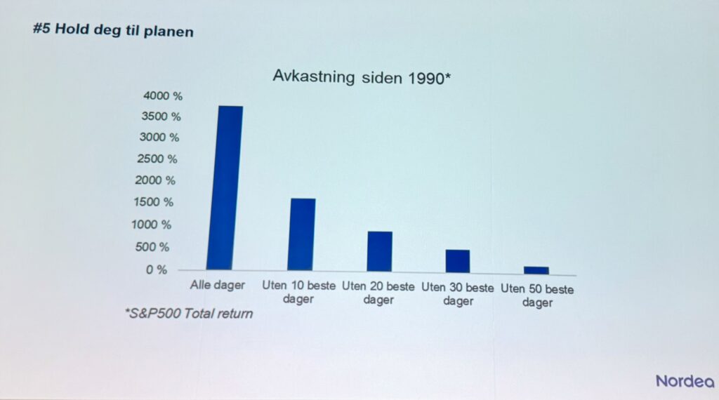 En investor som forsøker å time markedet, risikerer å ødelegge store deler av avkastningen. Uten de ti beste dagene siden 1990 forsvinner rundt to tredjedeler av gevinsten. Det fortalte Nordea-strateg Joachim Bernhardsen på Investeringsseminaret til Nordea i Bergen 18. november.