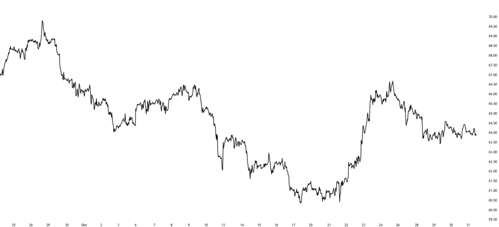 Oljepris går mot den tredje måneden på rad med fall. Påvirkningen av vestlige sanksjoner mot Russland og store russiske oljeprodusenter blir delvis dempet av en sterkere dollar, vekst utsikter og økende produksjon. Oljeprisen gjorde ett hopp da U.S. Department of the Treasury’s Office of Foreign Assets Control (OFAC) publiserte en pressemelding om nye sanksjoner mot Russland for å svekke Putins krigsøkonomi. Russlands to største oljeselskap, Rosneft og Lukoil var målet for sanksjonene. Oljeprisen har falt noe tilbake siden toppen 24 oktober etter bekymringene rundt russisk oljeflyt har avtatt noe.