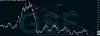 Vi har også lagt på bruddlinjer, markert med oransje fallinjer, som viser at man har stadige brudd ut fra nedtrenden, noe som resulterer i en rekylfase etter at bruddet er bekreftet. Rekylområdene er dermed kortere og kortere, noe som skaper en ny trend i det lange bildet.