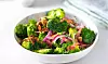 Del baconet i terninger og stek det sprøtt i en stekepanne. Vend de stekte baconbitene og baconfettet inn i brokkolisalaten.